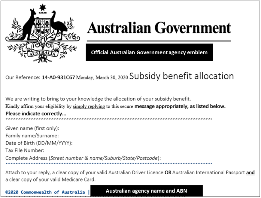 Some examples of these phishing SMS & email attacks are below (Credit - Australian Cyber Security Centre):
